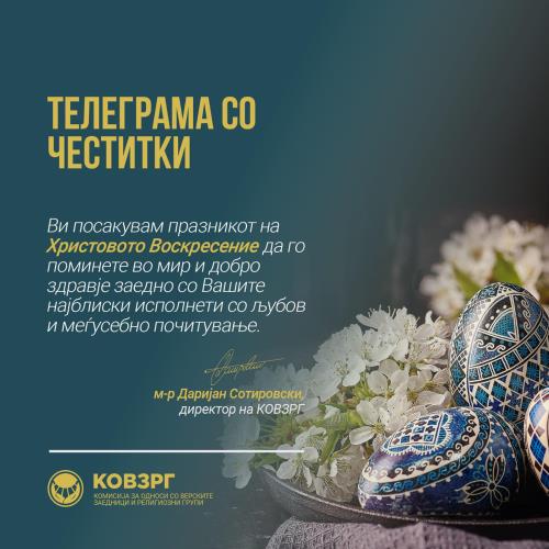 Директорот на КОВЗРГ, г-дин Даријан Сотировски по повод празникот Велигден упати телеграма со чести