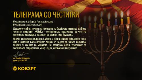 Drejtori i KMBFGR, z. Darijan Sotirovski, me rastin e festës së Hanukës, i dërgoi telegram urimi ud